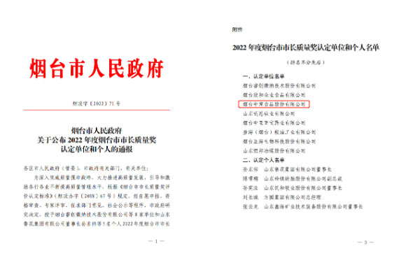 2022年度烟台市市长质量奖名单宣布 ,,, ,,,yd2333云顶电子游戏股份庆幸上榜!